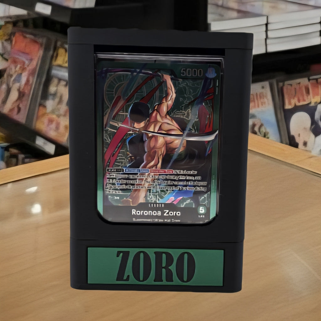 Keep your deck secure in style with this Zoro inspired deck box. It features a window on the front to display your leader in a standard mini snap and has storage in the bottom for counters. The top lid and bottom counter compartment attach to the main body via magnets.